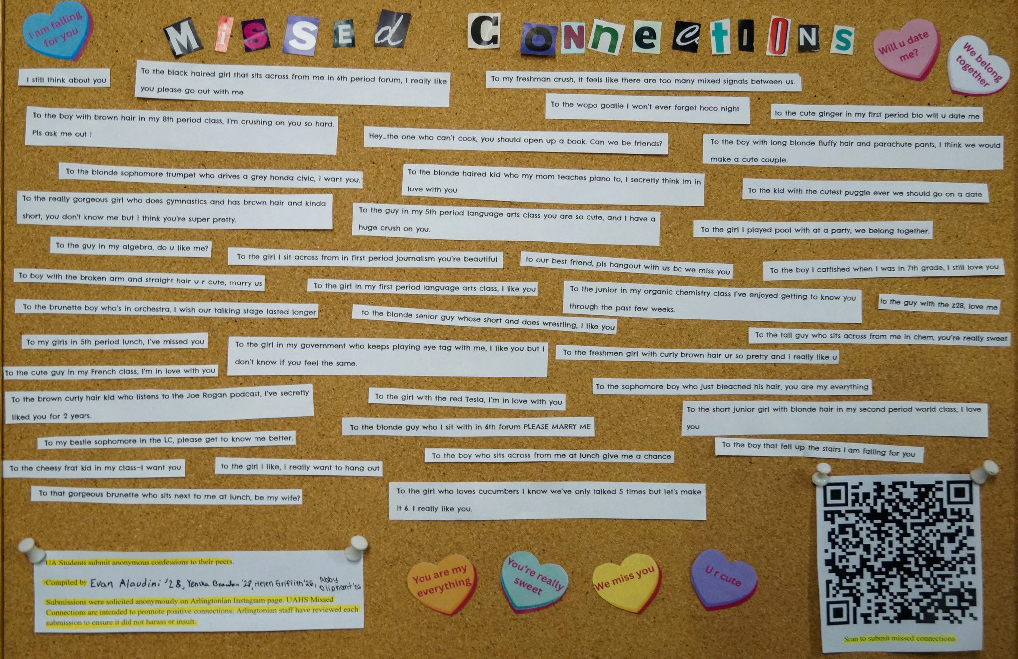 During my time as managing editor in the 2024–2025 school year, I paid close attention to how students actually engaged with Arlingtonian on distribution days. I listened to conversations in the hallways and watched where pages were turned first. Without fail, readers flipped first to Missed Connections, a section built from anonymous student submissions. The insight was clear. To better meet readers where they were, I focused on making participation more accessible. At the start of the year, when our school district implemented House Bill 250, restricting cell phone use during the school day, our previous social media submission method became ineffective. In response, I created a QR code to be printed in each issue, allowing students to submit entries during the school day using our school issued devices. Submissions increased from an average of thirty per issue to nearly two hundred, a clear increase in student response.